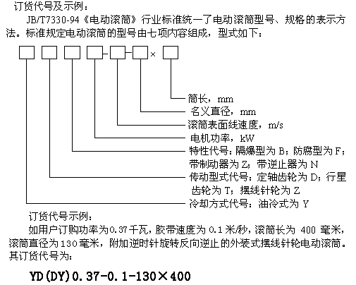 (2)用戶訂購逆止電動滾筒時,須注明旋轉(zhuǎn)方向,如不注明則為任意方向。其表示方法為在特性代號后加“S”(表示在電機(jī)引出線一側(cè)觀察,端蓋應(yīng)順時針旋轉(zhuǎn))或“N”(表示在電機(jī)引出線一側(cè)觀察,端蓋應(yīng)逆時針旋轉(zhuǎn))。